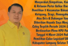 Lampung Selatan, Wartagraha.com – Kembali Terpilih menjadi Anggota DPRD Lampung Selatan Daerah Pemilihan (Dapil) 3 Kecamatan Penengahan, Bakauheni, Ketapang Ahmad Muslim, SE...